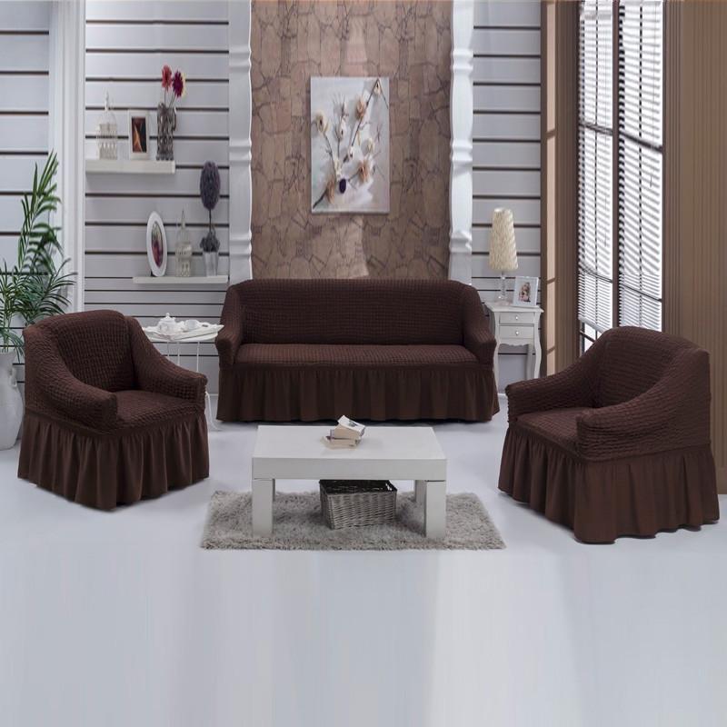 Чехол на диван и 2 кресла натяжной с рюшем laura горячий шоколад