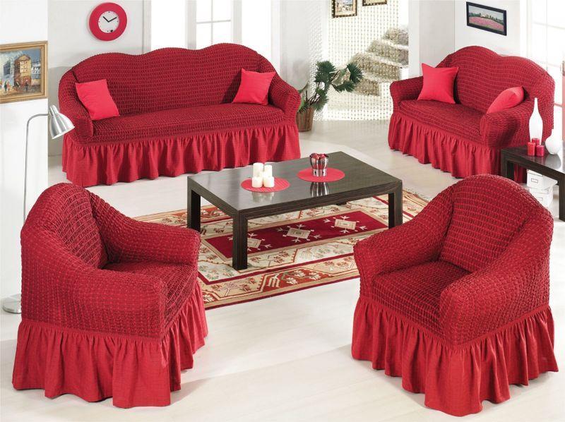 Натяжные чехлы с рюшем на большой и маленький диван и 2 кресла venera бордовые