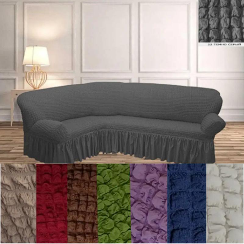 Натяжные чехлы на угловые диваны с юбкой жатка, еврочехол на угловой диван турецкий с обор...