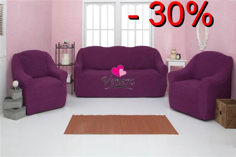 Чехол натяжной на диван и 2 кресла donna без оборки фиолетовый турция 225