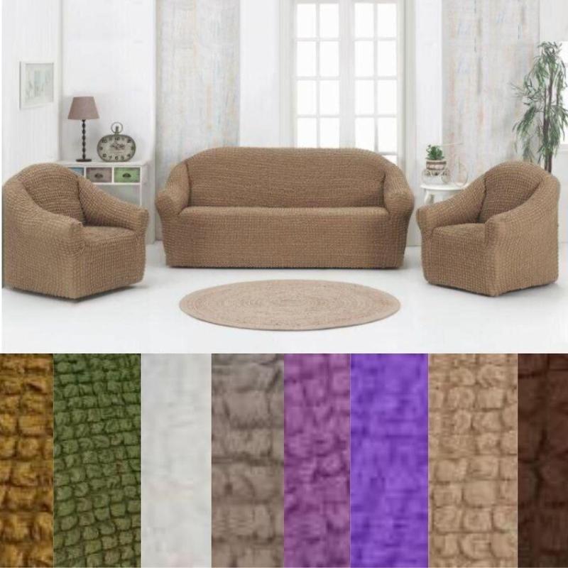 Съемные чехлы на кресла и диваны натяжные, накидки на диван и кресла с оборкой жатка капуч...