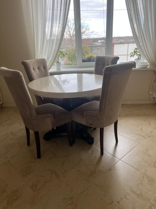 Стільниця зі штучного каменю, діаметр якоі 110 см Ніжка масивна дерев’яна Робили для себе під замовлення Стільчики також продаю -4 шт український виробник Лісма, дуже якісні, зручні. Велюр( Колір бежевий, тканина миюча ) Набором зі 4 -ма стільчиками продам за 16500 Фото і відео реальному покупцю скину, меблі дійсно в гарному стані Додатково фото і відео скину!