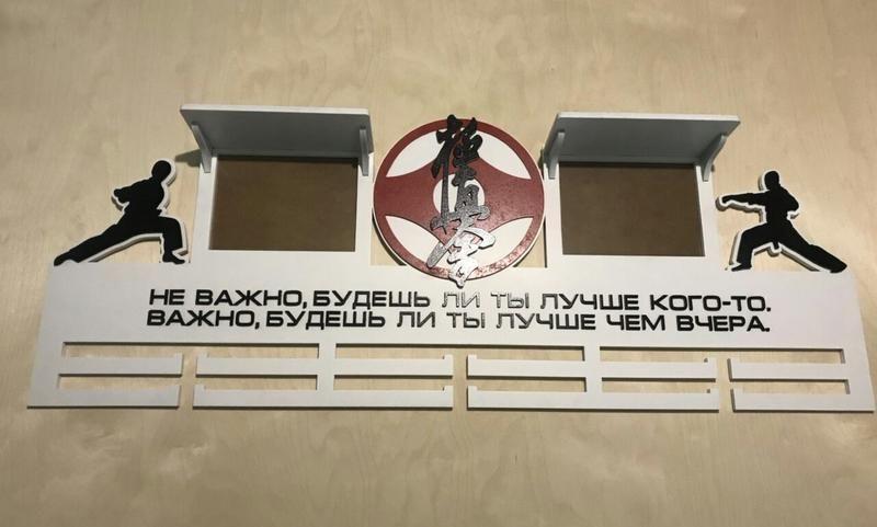Медальница из дерева "Карате" с полкой и фоторамками.(супер большая) Медальница Размеры , длина 100 см , с уникальным текстом, с полкой для кубков, и фоторамками 13х18 см. Изготовлена из фанеры толщиной 8 мм. Это просто шедевр изготовленный из дерева, способом лазерной резки , и окрашена акриловыми красками. Можно изготовить для любого вида спорта. Ваши медали всегда в порядке. материал - дерево размер можно делать любой под заказ силуэты спортсменов меняются в зависимости от пожеланий клиента цена указана за покраску как на фото (цвет можно выбирать) при изменении количества цветов цена рассчитывается индивидуально, в зависимости от сложности покраски если что-то кардинально менять в дизайне изделия, то цена рассчитывается индивидуально в зависимости от сложности работы все пожелания указывайте в комментариях к заказу Медальница - это отличный способ хранения медалей и наград. Медальницы спортивные изготовлены из дерева, окрашены и вскрыты лаком, что не только придает их внешнему виду изысканности, но и способствует долговечности и практичности в использовании. Дополнительные характеристики: Назначение : Для медалей Материал : Фанера Тип: Настенная Товар под заказ