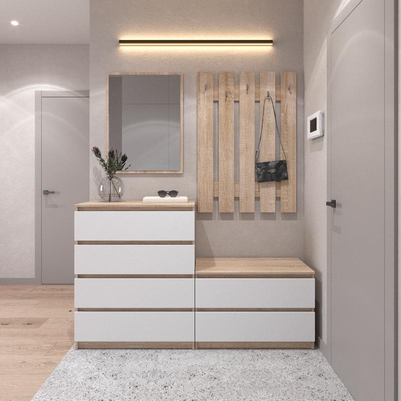 Комлект в прихожую №1 Стильная и эргономичная прихожая выполненная в современном стиле Состоит из 4 изделий: Комод на 4 ящика R-4, Комод на 2 ящика R-19, Зеркало D-4, Вешалка D-5 Преимущества комплекта: - Современный стиль - 6 шухляд на телескопических направляющих - Вешалка для верхней одежды - Зеркало - Красивые расцветки ламинированного ДСП с множеством вариантов комбинаций - Шухляды открываются за фасад без ручек Материал: ДСП Ламинированное 16мм Размеры комплекта (Ш/В/Г) : Ш 1604 / В 1950 / Г 400 мм Отправляем в разобранном виде Новой Почтой по всей Украине В комплекте вся необходимая фурнитура и пошаговая схема сборки Доступен для заказа в цветах: Белый корпус| Белый фасад| Белые планки Дуб Сонома корпус| Дуб Сонома фасад| Дуб Сонома планки Дуб Сонома корпус| Дуб Сонома фасад| Белые планки Дуб Сонома корпус| Белый фасад| Дуб Сонома планки Бетон корпус| Бетон фасад| Бетон планки Бетон корпус| Бетон фасад| Белые планки Бетон корпус| Белый фасад| Белые планки Венге Темный корпус| Венге Темный фасад| Венге Темный планки Венге Темный корпус| Венге Темный фасад| Белые планки Венге Темный корпус| Белый фасад| Венге Темный планки Антрацит корпус| Антрацит фасад| Антрацит планки Антрацит корпус| Антрацит фасад| Белые планки Антрацит корпус| Белый фасад| Антрацит планки
