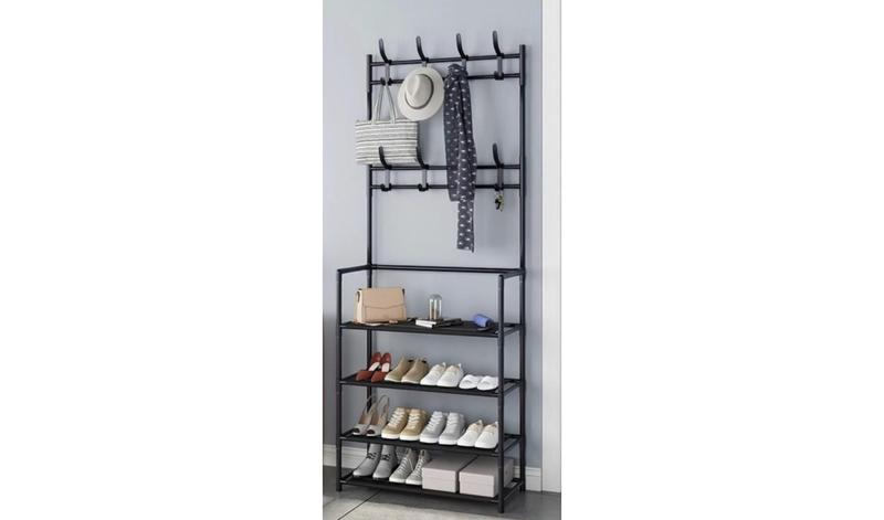 Стойка-прихожая черного цвета с 4 полками для обуви и 16 крючками для одежды. Размеры 60*29*160 см. Изготовлена из металла. Есть 4 полки, полки тканевые, также есть 16 крючков для развешивания одежды, акссесуаров. Крючки можно двигать по перекладинам на нужные вам растояния. Растояния между полками 16 см. Можно использовать как дома в гардеробной, так и в магазине.