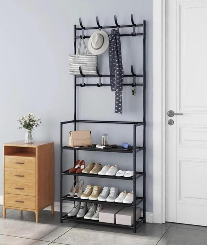 Стойка-прихожая черного цвета с 4 полками для обуви и 16 крючками для одежды. Размеры 60*29*160 см. Изготовлена из металла. Есть 4 полки, полки тканевые, также есть 16 крючков для развешивания одежды, акссесуаров. Крючки можно двигать по перекладинам на нужные вам растояния. Растояния между полками 16 см. Можно использовать как дома в гардеробной, так и в магазине.