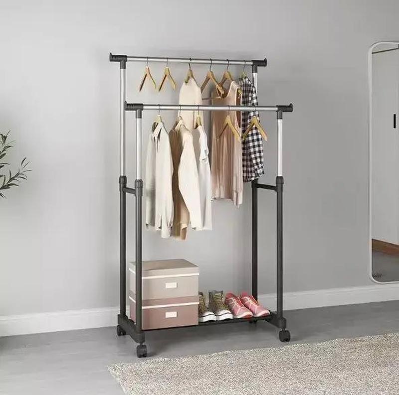 Стойка полностью сборная, и ее можно удлинить и сделать выше, или же сделать уже или ниже Так как стойка для одежды Double Pole полностью сборная, и к тому же без единого болта, винта или шурупа, собрать и разобрать ее, при необходимости, не составит больших трудностей и времени, в среднем на сборку уйдет не больше 20-30 минут (если не спешить). Все трубки стойки скрепляются с помощью крупных пластиковых зажимных замков. Трубки стойки Double Pole изготовлены из нержавеющей стали, полые внутри, поэтому. Пластиковые заглушки на концах выстирают труб, собранной конструкции, защитят одежду и предотвратят случайное падение одежды, если она будет просто накинут на стойку. Большим плюсом стойки для одежды Double Pole является наличие небольших колесиков, благодаря которым вы сможете передвинуть стойку даже полностью завешенную одеждой. Стойка Double выполнена как двухэтажная, для упорядочения и нормального, компактного, размещения одежды на ней. Боковые поперечные планки удобны для размещения на них, допустим, выглаженных брюк. Лучше всего для стойки использовать вешалки, так одежды можно разместить в разы больше.