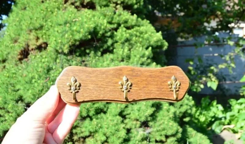 Прекрасные крючки для подвешивания кухонных полотенец, ключей, сумочек и т.д. Хорошая форма геральдической (королевской) лилии "Флер-де-лис". ИТАЛИЯ. Длина дубового основания - 18,5 см. Отличное состояние.
