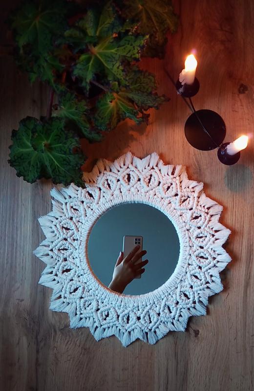 Дзеркало в світлому відтінку. Діаметр готового виробу 35 см,самого дзеркала-17 см.Під замовлення можливе виконання більших розмірів .