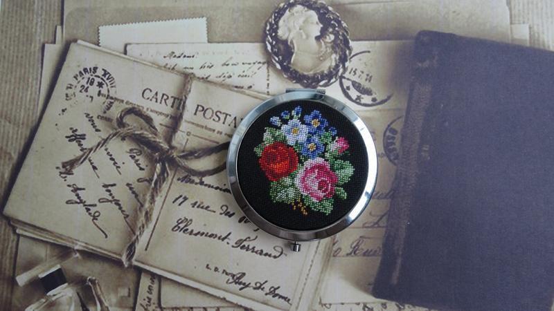 Яркий изысканный букет в викторианском стиле украсил зеркальце. Милая аксессуар для дамской сумочки.Зеркальце-футляр декорирован микровышивкой petit-point.