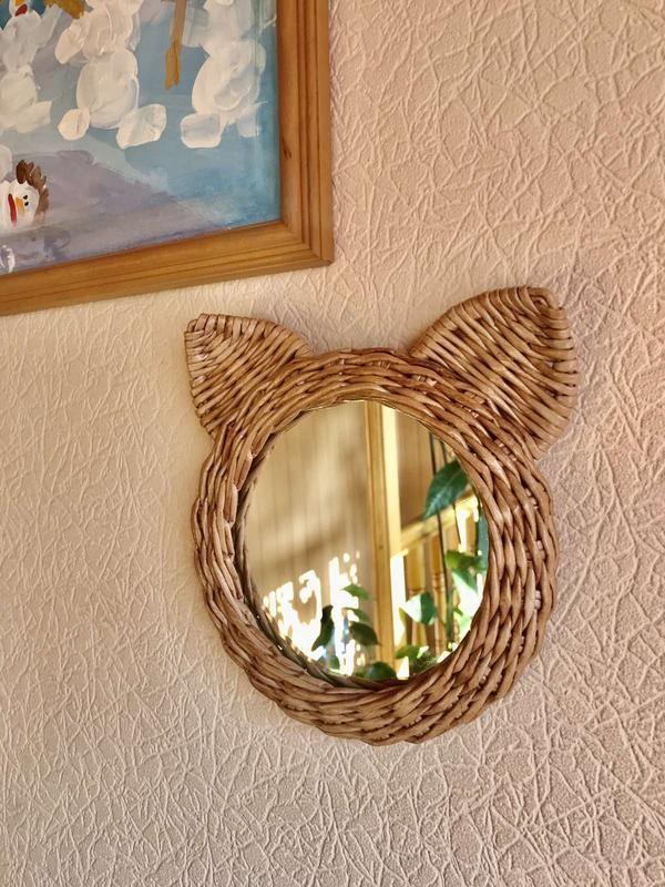 Зеркало в плетёной рамке в виде котика, ручная работа. Диаметр18 см или любой по Вашему выбору, с ушками высота 21 см, диаметр самого зеркала - 13 см. На обратной стороне петелька для крепления. Безопасно для детей - плетение обработано лаком на водной основе и не боится влаги. Размер , цвет и дизайн может быть другой по Вашему желанию, цена будет зависеть от размера. Товар под заказ, срок изготовления 7-14 дней