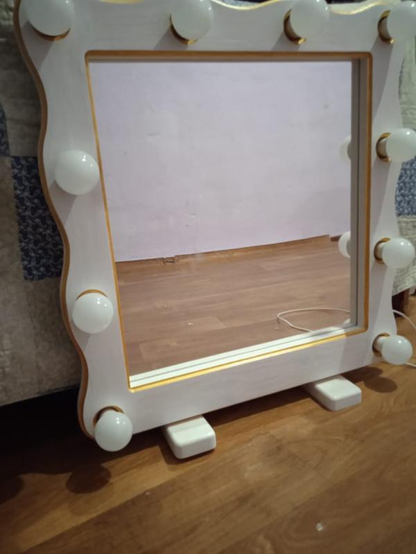 дзеркало с подсветкой (лампочки ) квадратное, из дерева, ручная работа, есть деревянные ножки подставки, можно ставить на некую поверхность, (или же желательно прикрепить на стену ) весомо так как сделаны из дерева цвета белый и коричневый