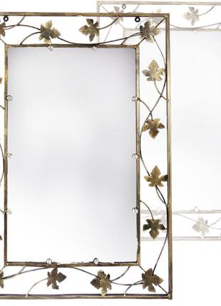 Зеркало в кованой раме малое Кованое зеркало - это настенное зеркало в декоративной металлической раме стилизованной под художественную ковку. Конструкция каркаса состоит из наружной и внутренней рамы из профильного металла, которые соединены сетью укрепленных металлических прутьев и украшены декоративными кованым листьями. Окраска выполнена в золотом цвете с элементами потертости под старину в винтажном стиле. Монтаж на стену осуществляется на два крепления (крючки, гвозди, шурупы или саморезы). Настенное зеркало одинаково хорошо будет смотреться в прихожей, гостиной или спальни. Кроме того, такое зеркало может стать украшением в интерьере любого общественного заведения. Размер(см): высота, ширина, глубина: 85х67х1.5