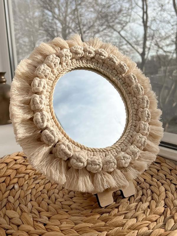 Зеркало на подставке изготовлено из хлопкового шнура, качественное шлифованное зеркало. Размер всего изделия 25 см само зеркало 17 см. Цвет шнура можно сделать другим. Также такое зеркала могу изготовить из рафии.Такое зеркало вам будет не только как функционал но и в качестве декора. Если ищете что-то особенное на подарок это будет хорошим вариантом. Будет хорошо упаковано в пупырку и Крафт коробку