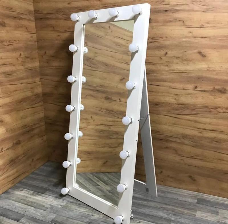 Дзеркало-мольберт 180х80 см Профессиональное освещение – 14 LED ламп обеспечивают равномерный яркий свет без теней. Идеальный размер – 180х80 см для комфортного обзора в полный рост. Современный дизайн – стильная белая рама подходит к любому интерьеру. Удобная конструкция – устойчивая опора. Состояние - как новый!