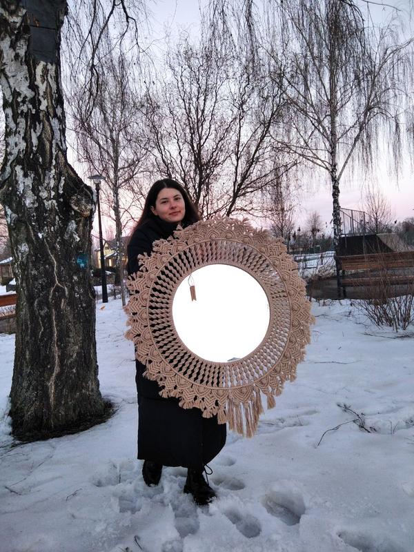 Розкішне дзеркало виконано в техніці макраме з натуральної нитки (100% бавовна), колір какао. Діаметр дзеркала 45см, сплетінням 90-96 див. Неймовірно красиво виглядають в інтер'єрі. Можливо виконати в іншому розмірі і кольорі.