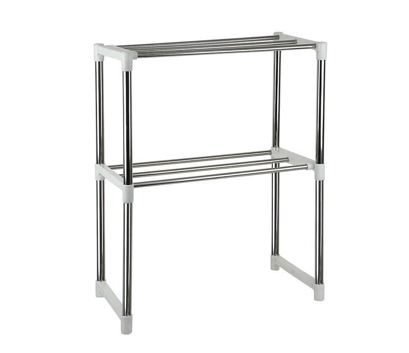 Полка-органайзер для микроволновой печи A-Plus 8018/MO-360 Полка для микроволновки или другой бытовой техники. Каркас выполнен из металлических трубок, соединенных пластиковыми креплениями. Две широкие полки позволят организовать пространство и удобно разместить над микроволновой печью много кухонных принадлежностей. Раздвижные полки позволяют регулировать ширину стеллажа: от 50 до 85 см, поэтому конструкция подойдет даже крупногабаритной микроволновке. Стеллаж выполнен в элегантном классическом дизайне, подойдет для любого современного интерьера. Можно использовать не только на кухне, но и для разных хозяйственных нужд. Характеристика: Вид: Полка-органайзер Материал: Металл, пластик Цвет: Стальной/белый Комплектация: Раздвижные полки – 2 шт., металлические трубки – 8 шт., пластиковые ножки-крепления – 2 шт. , заглушки – 8 шт. Размеры в собранном виде: 50-85*25*60,5 см Размер в упаковке: 50*26*4 см