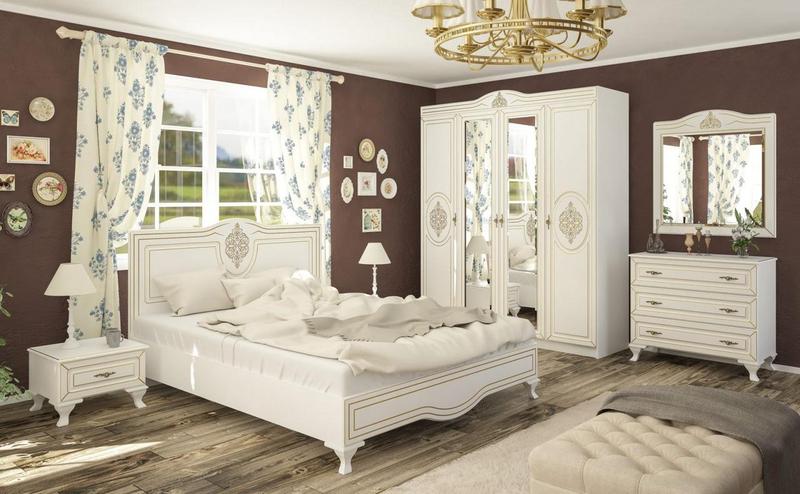 Модульна спальня "Мілан 4Д" меблевої фабрики "Мебель-сервіс" може помітно прикрасити інтер'єр Вашого будинку, через використання сучасних і в той же час класичних тенденцій в оформленні декору меблів. Колекційна модель складається з декількох елементів, які елегантно впишуться в домашній інтер'єр і створять сприятливі умови для сну і відпочинку. Товари системи коштують недорого, як для виробів з білим кольором, різьбленням і патиною. На всіх фасадах використовується технологія патинування. Корпус з ДСП, фасад покритий МДФ з різьбленням і патиною, все в білому кольорі. У комплект входить: ліжко (без матраца і каркаса); тумба (2 шт.); шафа 4Д; комод; люстро. Елементи, що входять в комплект можна придбати окремо