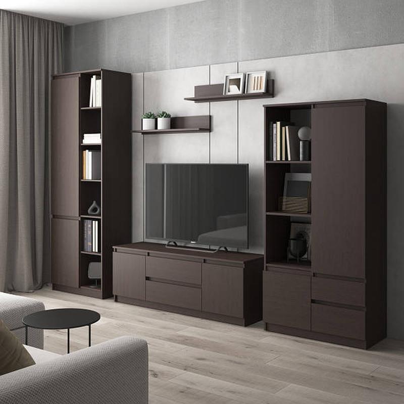 Современный стильный комплект мебели с фасадами без ручек состоит из шкафа, шкафа, тумбы под телевизор и из 2-х полочек Этот комплект мебели в гостиную отлично впишется в любой интерьер. Преимущества комплекта: - Современный стиль - Выдвижные ящики на телескопических направляющих - Шкафы с открытыми и закрытыми полками - Красивые расцветки ламинированного ДСП с множеством вариантов комбинаций - Ящики и двери открываются за фасад без ручек