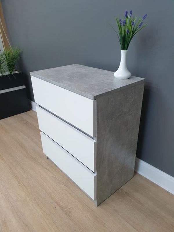 Предлагаем стильный комод "Меры" на три шахляда в следующих цветах: - Белый - Дуб Венге магия - Дуб Аппалачи/Нимфеа Альба - Венге/белый - Дуб Аппалач Размеры 700×602×370 Заводское качество обработки деталей! -Сверхное сверление. -ДСП 16 мм. SwissKrono -качественная кромка ПВХ Polkemic Польша (пластмасса 0.6 ). -Хоротная фурнитура, телескопические направляющие - полный выдвижной. Изделия предлагаются в разобранном виде, в двух упаковках. Для сборки присутствует пошаговая детальная инструкция с иллюстрациями, и с набором всей фурнитуры. Состав изделия- одна упаковка. Отправка с подпиской 250 грн