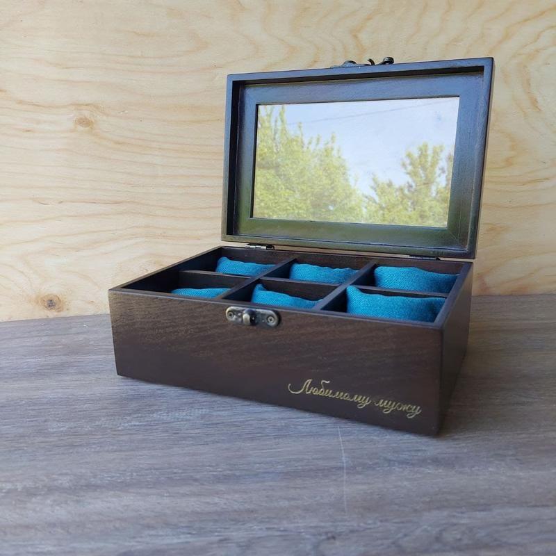 Шкатулка для хранения 6 часов с индивидуальной гравировкой. Всегда актуальный, и полезный подарок. Шкатулка выполнена из натурального дерева ольха. 6 индивидуальных ячеек для хранения. Внутри каждой ячейки подушечка для бережного хранения. Шкатулка выполнена с крышкой. Благодаря этому часы защищены от пыли, грязи и прямых солнечных лучей. Шкатулка закрывается на удобную защелку, что позволяет надежно хранить содержимое. Вместимость - 6 часов; Материал - натуральное дерево ольха; Закрывается крышкой Внутри каждой ячейки подушечка из темно-синей рогожки ; Цвет шкатулки - коричневый Цвет фурнитуры - бронза Такая шкатулка станет незабываемым, нужным и особенным подарком. По желанию, возможно изменить гравировку, выполнив ее в виде буквы, слова, предложения, рисунка.