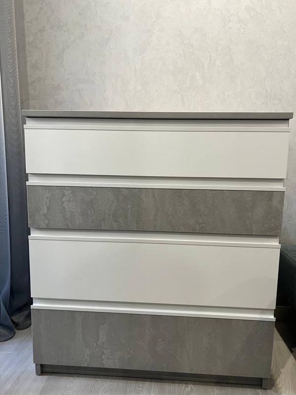Продається сучасний комод у мінімалістичному стилі. Поєднання білих фасадів та сірого декору «під бетон» виглядає дуже стильно й універсально — легко впишеться у спальню, вітальню чи передпокій. Висота: 90 см Ширина : 80,5 см Глибина: 45 см Стан: відмінний, без сколів і пошкоджень Матеріал: ЛДСП високої якості Колір: білий + сірий (бетон) Фурнітура: надійні металеві напрямні, ящики висуваються плавно Місткість: кілька глибоких ящиків — зручно для зберігання одягу, білизни чи інших речей Комод акуратний, доглянутий, використовувався бережно. Чудовий варіант для тих, хто цінує практичність та сучасний дизайн. Самовивіз / деталі — за домовленістю.