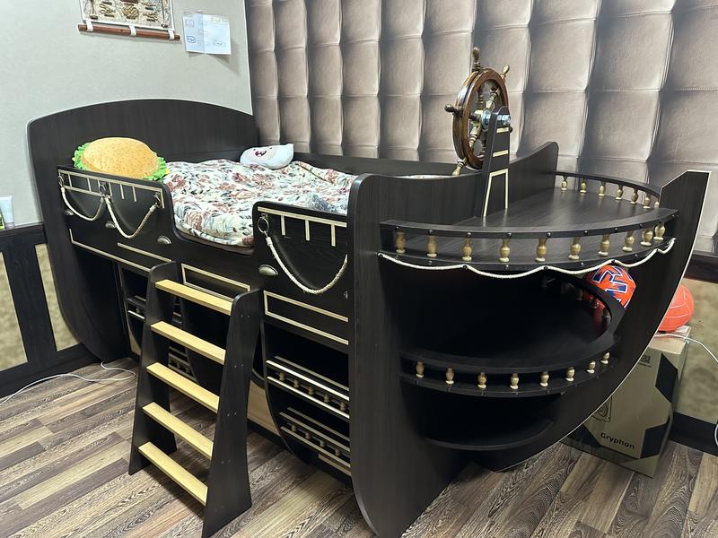 Двухъярусная кровать с матрасом, где первый ярус для игры, хранение игрушек, второй для отдыха. Размеры: длина 190 см, ширина 120 см, высота 110 см, общая длина 250 см.