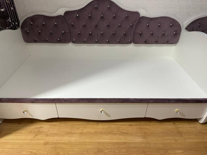 Детская кровать, фабрика Renessans, серия Гламур. Кровать в отличном состоянии и почти не была в использовании, без нюансов! Сделано из высококачественных материалов и с качественной фурнитурой. Имеет снизу три выдвижных ящика с ручками в виде страз. Фасады ящиков изготовлены из глянцевого МДФ (Турция), цвет - Белый глянец; - детали корпуса изготовлены из высококачественного ЛДСП 25 и 16 (мм) производства SWISS KRONO (Украина), цвет - Белый гладкий Нимфея Альба. - направляющие и петли одной из лучших Европейских фабрик - Blum (Австрия) c системой амортизации BLUMOTION; - используется качественная ткань - велюр, коллекция - Альмира; - фасады, фасадные элементы декорированы мягкими элементами: мебельная ткань велюр + ППУ 20-40 мм, отделка - «каретная стяжка» со стразами в ткани. Цвет велюр чуточку ярче чем на фото, размер кровати 180*90
