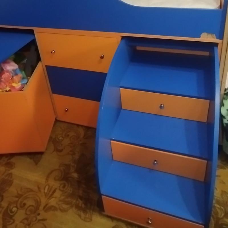 Детская кровать-горько-трансформер. С столом на колесах, комодом, корзиной для игрушек и лестницей с выдвигающимися ящиками на колесах. (продается с матрасом) Кровать: Спальное место-190х90 см Длина-190 см Висота-100 см. Состояние: 8/10 есть маленькие повреждения, на фото их можно увидеть, но они очень легко убираются и не влияют на качество и функции кровати. Дополнительные фото могу сделать, если нужно! Стол выдвигается на колесах, имеет шкафчик с полками для книг. Лестница имеет встроенные 3 выдвижных ящика, которые выдвигаются на телескопических направляющих. Сами лестницы легко выдвигаются на колесах. Корзина для игрушек очень большая. Комод очень вместителен, имеет три полки для хранения вещей. Только самовывиз.