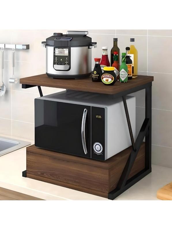 Подставка Rack‐217 для микроволновой печи — сочетание функциональности, прочности и лаконичного дизайна: Конструкция: прочный металлический каркас 20×20 мм со устойчивым к царапинам черным покрытием. Практичные полки: две прочные ламинированные полки цвета «Горих», которые устойчивы к влаге и легко очищаются. Встроенный ящик: выдвижной ящик для хранения кухонных мелочей, упаковок или аксессуаров. Флисовые ножки: защищают пол от повреждений и добавляют устойчивости. Размеры: высота 650 мм, ширина 600 мм, глубина 400 мм; вес около 10 кг - практичный и компактный стеллаж, идеальный для кухни.