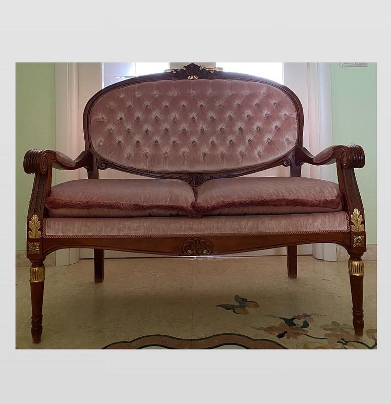 Софа з горіха, різьблений, покритий сусальним золотом, оздоблена оксамитом, виробництво Італія. загальний розмір 175/115/70 см.