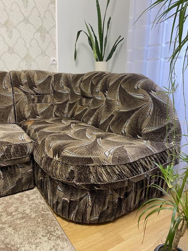 Довжина основної частини дивану - 2 м.; (бік) ширина - 0,90 см. Довжина кутка - 0,90 см.; (бік) ширина - 1,50 м. Цей комфортний диван має вигнуту форму та багатий візерунок у коричневих відтінках. Матеріал оббивки м’який на дотик та зносостійкий. Сидіння глибокі, спинка висока з додатковими м’якими елементами, що забезпечують підтримку спини. На оббивці дивана є невелике ушкодження у вигляді потертого місця з вираженим зміненням кольору. Ціна: 6000 (можливий торг)