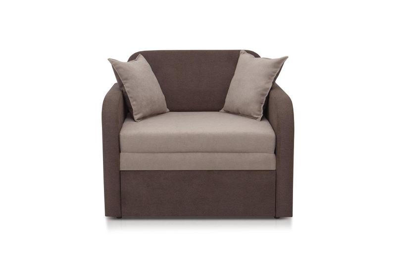 Характеристики:Ширина: 970 мм; Глибина: 800 мм. Висота спинки: 800 мм; Висота підлокітників: 650 мм; Товщина підлокітників: 85 мм; Висота посадки: 450 мм; Ширина спального місця: 800 мм; Довжина спального місця: 1950 мм Каркас: ДСП + ДВП + Дерево. Наповнення: Поролон 25-ї щільності товщиною 100 мм на ламелях. В комплект входить дві подушки розміром 40*40мм. Також є ніша для білизни. Матеріал оббивки в складській програмі (поєднання тканин) Аляска 03/Аляска 23 ( Exim Textil)