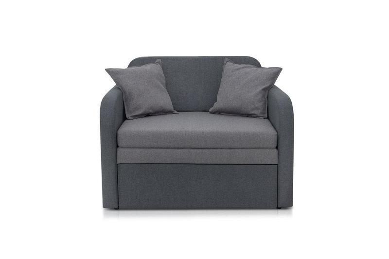 Характеристики:Ширина: 970 мм; Глибина: 800 мм. Висота спинки: 800 мм; Висота підлокітників: 650 мм; Товщина підлокітників: 85 мм; Висота посадки: 450 мм; Ширина спального місця: 800 мм; Довжина спального місця: 1950 мм Каркас: ДСП + ДВП + Дерево. Наповнення: Поролон 25-ї щільності товщиною 100 мм на ламелях.В комплект входить дві подушки розміром 40*40мм. Також є ніша для білизни.Матеріал оббивки в складській програмі (поєднання тканин) Аляска 95/Аляска 90 ( Exim Textil)