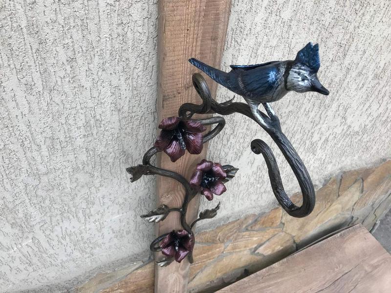 Кованый крючок для растений с веткой гибискуса (цветы гибискуса) и синим лучом