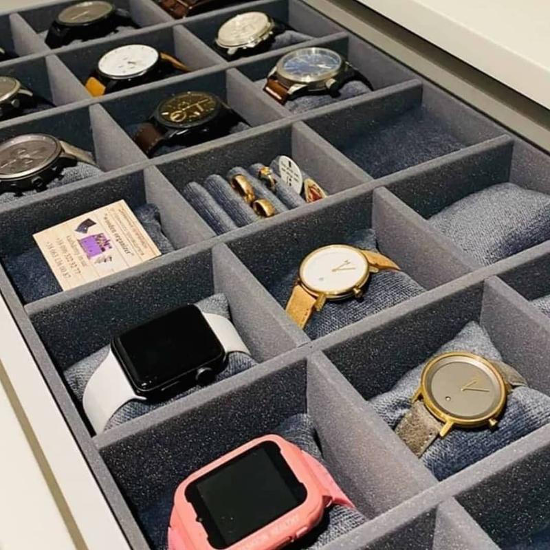 Модуль для хранения часов и колец, выполненный в технике флокирования. Сдержанный, компактный и вместительный модуль разработан по индивидуальному дизайну. Вместительность: Для хранения 20 часов. Для каждых часов есть отдельная ячейка для хранения, внутри каждой ячейки расположена подушечка для бережного хранения; Небольшой отдел для хранения колец и мелких украшений. Мы разрабатываем модули по запросу и пожеланию заказчика. При этом учитывается место хранения, подбираются ячейки для размещения необходимых аксессуаров и украшений, продумывается цвет и размер будущего органайзера. Также, составляется подробный макет ( представлен в галерее). На таком макете наглядно видно размещение всех ячеек и их размеры. Наши модули разрабатываются индивидуально для каждого клиента, чтобы не только выглядеть роскошно, но и эффективно хранить драгоценности, часы, кольца, браслеты, солнцезащитные очки и другие аксессуары. Чтобы создать индивидуальный дизайн вашего модуля для хранения, свяжитесь с нами. Товар под заказ