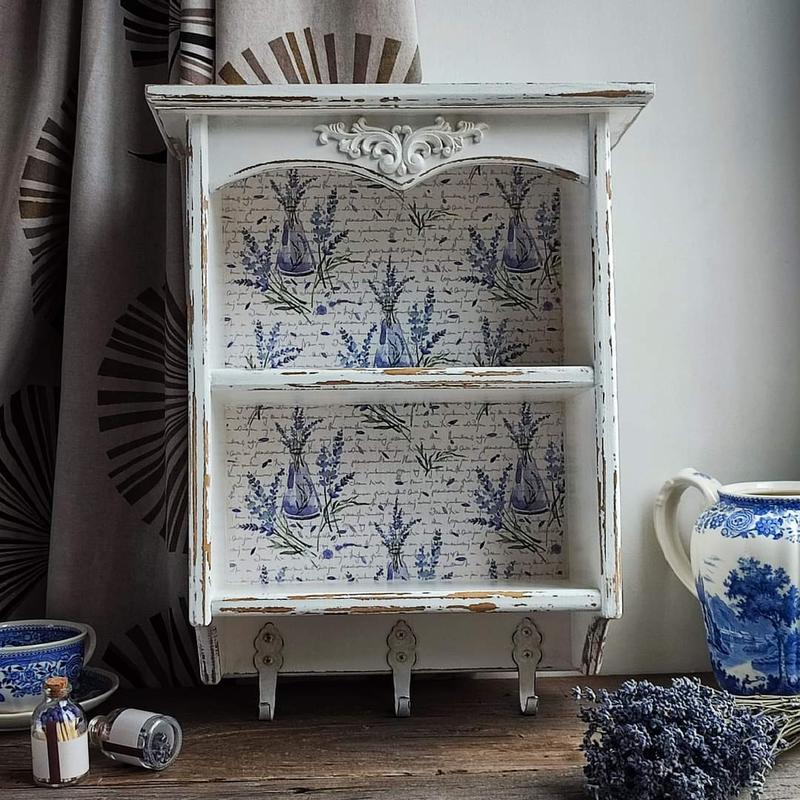 Поличка Прованс. Отличная полочка для кухни, очень лавандовая, прованская, французская! По низу идет ряд крючков, что удобно для того, чтобы повесить полотенце, прихватки, чашки (как у меня на фото), или что-то другое. Полочка украшение и радость для вашей кухни. В наличии и по заказу. Высота 38 см, ширина 29, глубина 14.см. Дерево ольха, ручная работа.