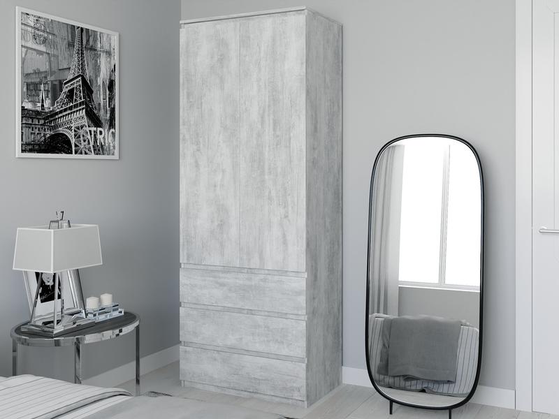 Фасад : ДСП Ламинированная Корпус : ДСП ламинированная Цвет Шкафа (варианты) : - белый - дуб сонома - бетон - венге темный - антрацит - дуб сонома/белый - бетон/белый - венге темный/белый - антрацит/белый - белый/дуб сонома - белый/антрацит - антрацит/дуб сонома Толщина материала ДСП : 16 (мм) Телескопические направляющие Высокая устойчивость к царапинам благодаря покрытию из меламиновой смолы 3 выдвижных ящика Штанга для одежды Доступно в 12 цветах