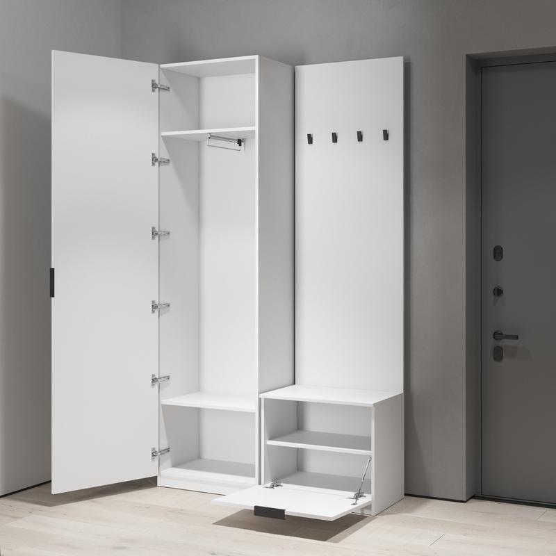 Комплект из двух товаров Шкаф с штангой M - 42 Собственное производство Цена 3190 грн Размеры: Ширина: 602 мм Высота: 2195 мм Глубина: 400 мм Вешалка для прихожей, напольная с тумбой для обуви M-43 Собственное производство Цена 2190 грн Размеры: Ширина: 602 мм Высота: 2195 мм Глубина: 400 мм Кольори: Белый Дуб сонома Бетон Венго темный Антрацит Доставляется Новой Поштой по всей Украине в разобранном виде (это уменьшает риск повреждений и значительно снижает стоимость доставки) В комплекте есть вся необходимая фурнитура и пошаговая инструкция по сборке, все отверстия проскальзаны.
