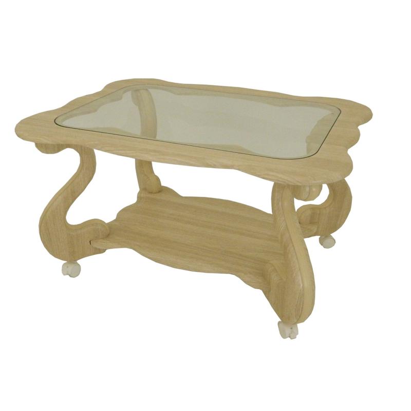 Журнальний стіл "МС-7 Креатив" з прозорим склом та ніжками кольору дуб білений. Розмір: 800х600х470 мм. Скло може бути тонованим або прозорим. Можливі кольори ніжок: Глянцева плівка: білого кольору, кольору слонової кістки. Деревоподібна плівка: дуб білений, світлий горіх, горіх, темний горіх, венге.