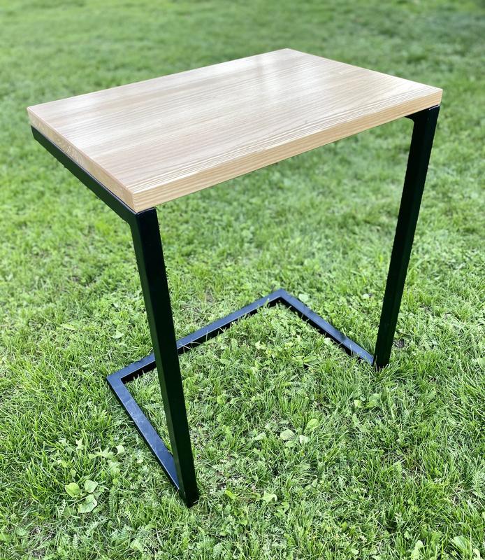 Приставной столик очень удобная и практичная вещь для вашего дома. На нем легко разместятся вещи, необходимые для работы или отдыха. Каркас сделан из металлической трубы и окрашен в чёрный цвет. Имеет защитные накладки на ножках , которые предотвращают повреждение пола. Столешница изготовлена из натурального дерева , и покрыта лаком . Высота столика -- 620мм Ширина -- 500 мм Глубина -- 350 мм