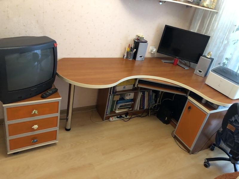 Стол в детскую комнату, для подростков. Большой, с толстой двойной столешницей. С местом для системного блока компьютера, полками для тетрадей и книг и тумбой с дверцей. Есть дополнительная тумба на три выдвижных ящика на колесах и два навесных настенных полки в комплекте. Качественный.