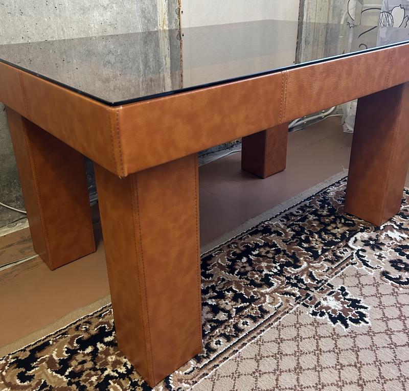Стол обит кожей коричнево-рыжого цвета Квадратные ножки 700*1000
