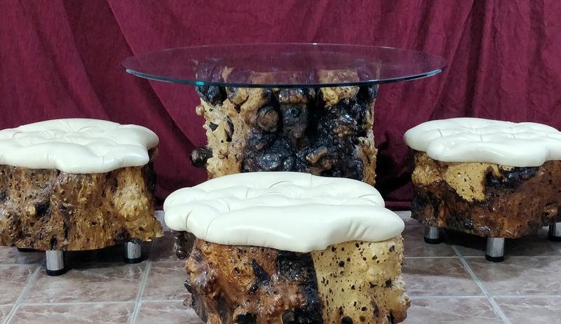 Комплект кавового столика: стіл + три пуфики. Виготовлений із суцільного дула капової деревини (дика оливка) Поверхня — загартоване скло. Діаметр: 900 мм. Товщина: 10 мм. Покриття деревини — поліуретановий лак, шість шарів.