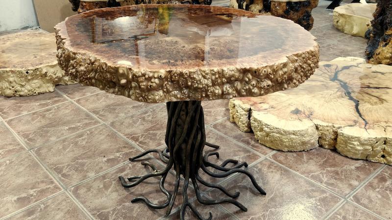 Кавовий столик. Стільниця: кап в'язка ВИСШИЙ сорт. (укрита лаком) Обрамлення та ніжки виготовлені з якорного ланцюга. Розмір: висота — 500 мм. діаметр — 650 мм. товщина стільниці — 60 мм