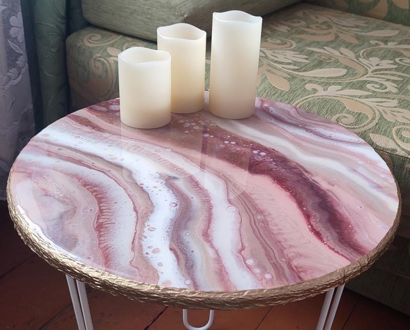 Унікальний стіл ручної роботи в техніці "Зріз каменю Агат". Стільниця виготовлена з епоксидної смоли! на основі мдф. НІЖКИ РОЗБІРНІ! Що дає змогу зручно транспортувати стіл. Розмір столу: стільниця 50 см, висота ніжок 50 см. Додаткові характеристики: Матеріал: Дерево Колір: Бежевий Стільниця: МДФ Каркас, ніжки: кований метал