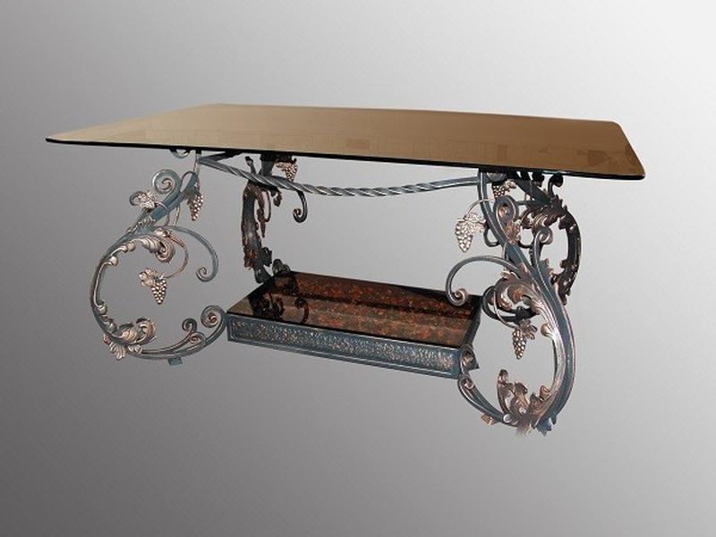 Кованые столы для дома, журнальные столики, Дизайнерский столик лофт Характеристики: - Тип - стол - Материал - металл- квадрат 12, 14, 16 мм, круг 6.5 мм, декоративные элементы, стекло 8 мм - Размер - 1500*1000*650 мм - Вес - 44кг - Покрытие -грунт, краска кузнечная, патина - Производитель - Украина. ОПИСАНИЕ: Кованый журнальный столик: элегантность в каждой детали Этот журнальный столик - истинное воплощение изысканного стиля и практичности. Его прямоугольная форма, подчеркнутая плавными линиями кованой основы, придает ему элегантный вид, а тонированное стекло столешницы с закругленными углами привносит в интерьер нотку современности. Игра света и цвета: Тонированное стекло столешницы придает столу особый шарм, создавая игру света и теней. За счет его прозрачности, свет проникает сквозь него, создавая уютную атмосферу в помещении. Декоративная изюминка: Нижняя полочка, украшенная декоративными камнями, скрытая под стеклом, - это изысканная деталь, которая добавляет столу неповторимый шарм. Она не только функциональна, но и служит прекрасным элементом декора, который привлекает взгляд и делает интерьер более интересным. Сочетание стиля и практичности: Этот кованый столик - это идеальное сочетание стиля и практичности. Он станет прекрасным дополнением к любому интерьеру, а его прочная конструкция позволит ему служить вам долгие годы.