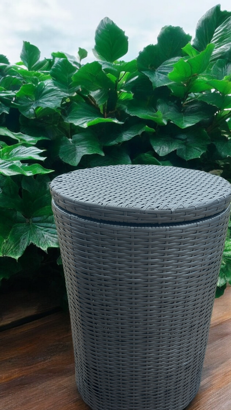 стол плетеный из искусственного ротанга, основание металлическое, высота 80см, диаметр 55мм. крышка снимает тёмя, что позволяет хранить вещи.