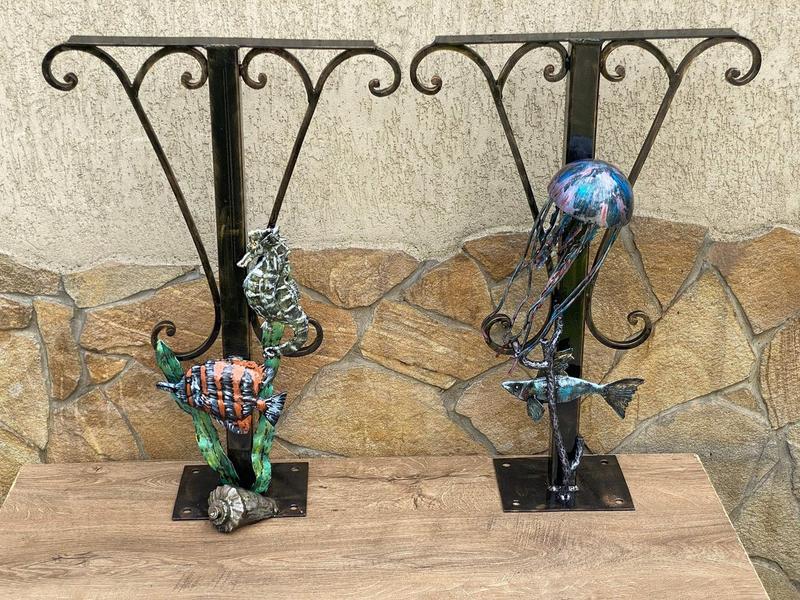Вот набор из двух ручных кованых столов на тему «ноги в океане». Эти столы можно использовать как кухонные или обеденные столы, просто добавив столешницу. Вы не найдете ничего подобного - выполнены в технике художественной ковки, декорированы медузой, морским коньком, водорослями, двумя различными рыбками, ракушкой и веткой коралла. Они станут ярким акцентом любого интерьера. Размеры: - Высота: 70 см Цвет: черный с добавлением бронзы, золота, синего, меди, зеленого, серебристого, лакированный. Цена указана за комплект из двух ножек.