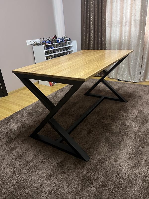 Стол размера 140x80x80 см с деревянной столешницей, лакированной поверхностью и массивными металлическими ножками черного цвета. Ручная работа